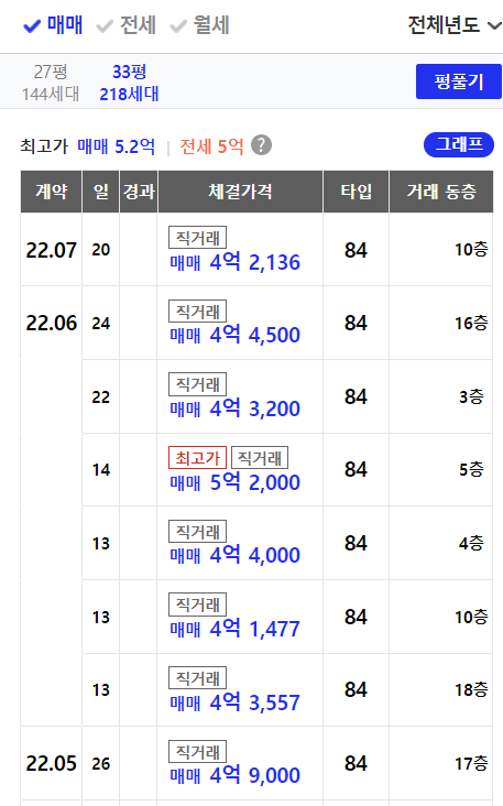 가장 궁금하신 부분은 시세일텐데요. 비교대상 아파트는 바로 앞의 금호지구대광로제비앙이 되겠습니다. 2022년 3월에 입주 시작한 아파트로 세대수는 361세대라 위파크 마륵공원보다는 작은 규모이나 일단 가격 비교 측면에서만 살펴보겠습니다. 84타입 정도만 비교가 가능할 것 같습니다. 좌측 아래 실거래가를 보면 최고가는 5.2억이며 작년 7월 이후 실거래가 없는 관계로 비교는 힘들 것 같습니다. 해당 아파트의 호가를 보면 아예 84타입이 없기 때문에 비교는 힘들겠으나, 시세에 근접하게 나온 것이 아닐까 추정해봅니다. 아파트 한 군데를 더 살펴보았습니다. 아래쪽의 매월아델리움&로제비앙인데요. 2017년식 아파트이나 세대수는 686세대로 비교가 가능한 수준으로 보입니다. 해당 아파트는 최근에 실거래가가 있어서 비교가 가능한데요. 우측 아래 실거래를 보시면 4억 초반 수준으로 확인됩니다.