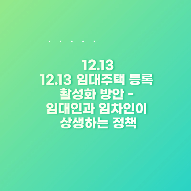 문재인 정부 출범 이후, 7월을 제외하고는 매달 부동산 정책 혹은 방향 발표가 있었습니다. 11월까지 다섯차례의 발표가 있었는데 대부분의 내용은 주택시장을 어지럽히는 다주택자들을 제어하는 내용이었습니다. 그런데 12월 13일에 발표한 임대주택 등록 활성화 방안은 처음으로 임대인과 임차인, 또한 정부도 상생할 수 있는 정책이었다고 생각합니다. 물론, 부작용 또한 없진 않았다고 생각은 하는데 이 부분은 마지막에 말씀드려보겠습니다.