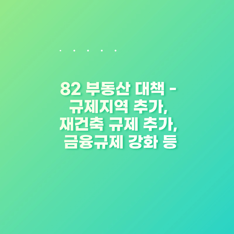 지난 포스팅에 이어 이번에는 문재인 정부의 두번째 부동산 정책인 82 부동산 정책에 대해 리뷰를 하겠습니다. 8.2 부동산 정책은 부동산 규제의 종합선물세트와도 같았다 보시면 될 것 같습니다. 대부분의 규제가 이 때부터 시작되었는데 좀 더 자세히 살펴보겠습니다.
